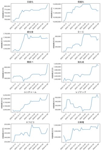第1位 信越化: +12% (9,968,805百万円→11,409,981百万円) 第2位 日産化: +12% (703,753百万円→779,664百万円) 第3位 資生堂: +10% (1,534,000百万円→1,684,800百万円) 第4位 レゾナック: +7% (516,151百万円→550,636百万円) 第5位 DIC: +7% (234,419…