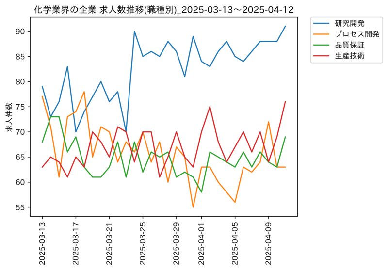 2025-04-12 化学業界の企業 求人数ランキング(職種別) 2025-04-12時点 【化学】1カ月間の求人件数の変化ランキング 第1位 研究開発(79件) 第2位 プロセス開発(77件) 第3位 品質保証(68件) 第4位 生産技術(63件)https://www.ee-ties.com/より作成